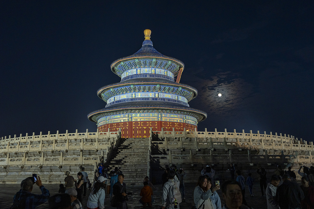 中秋佳节,北京天坛公园祈年殿亮灯,一轮圆月从东方升起,与祈年殿交相辉映。