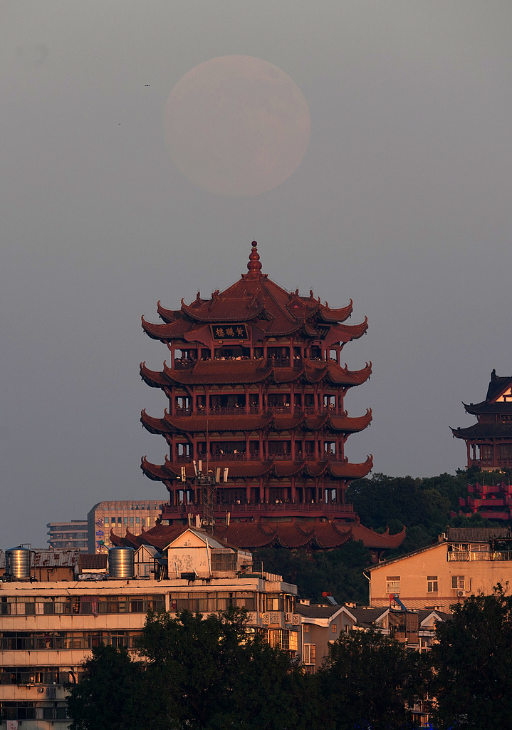 中秋佳节,一轮明月从夕阳和薄雾下的武汉黄鹤楼上缓缓升起,吸引了众多市民前来观看。