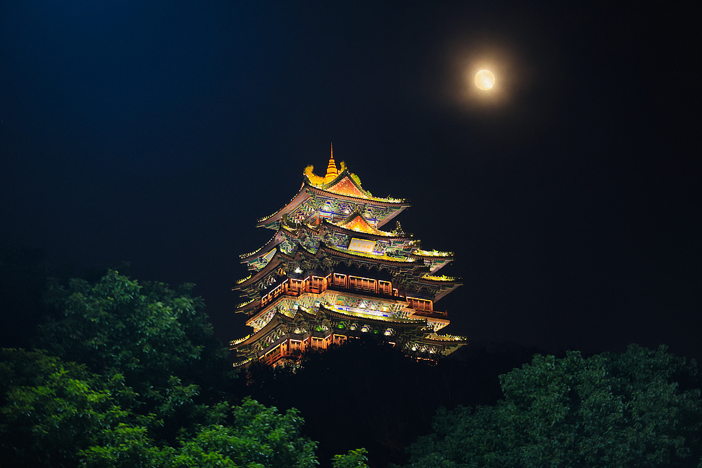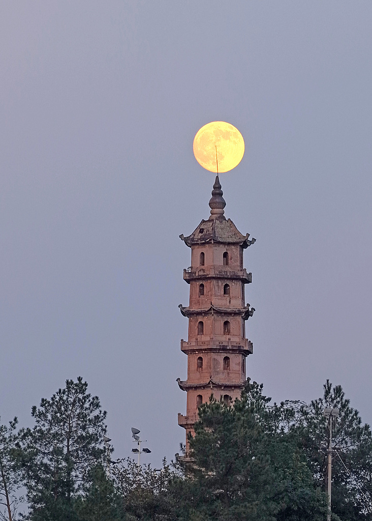 一轮圆月从浙江省台州市仙居县安洲塔上空升起。