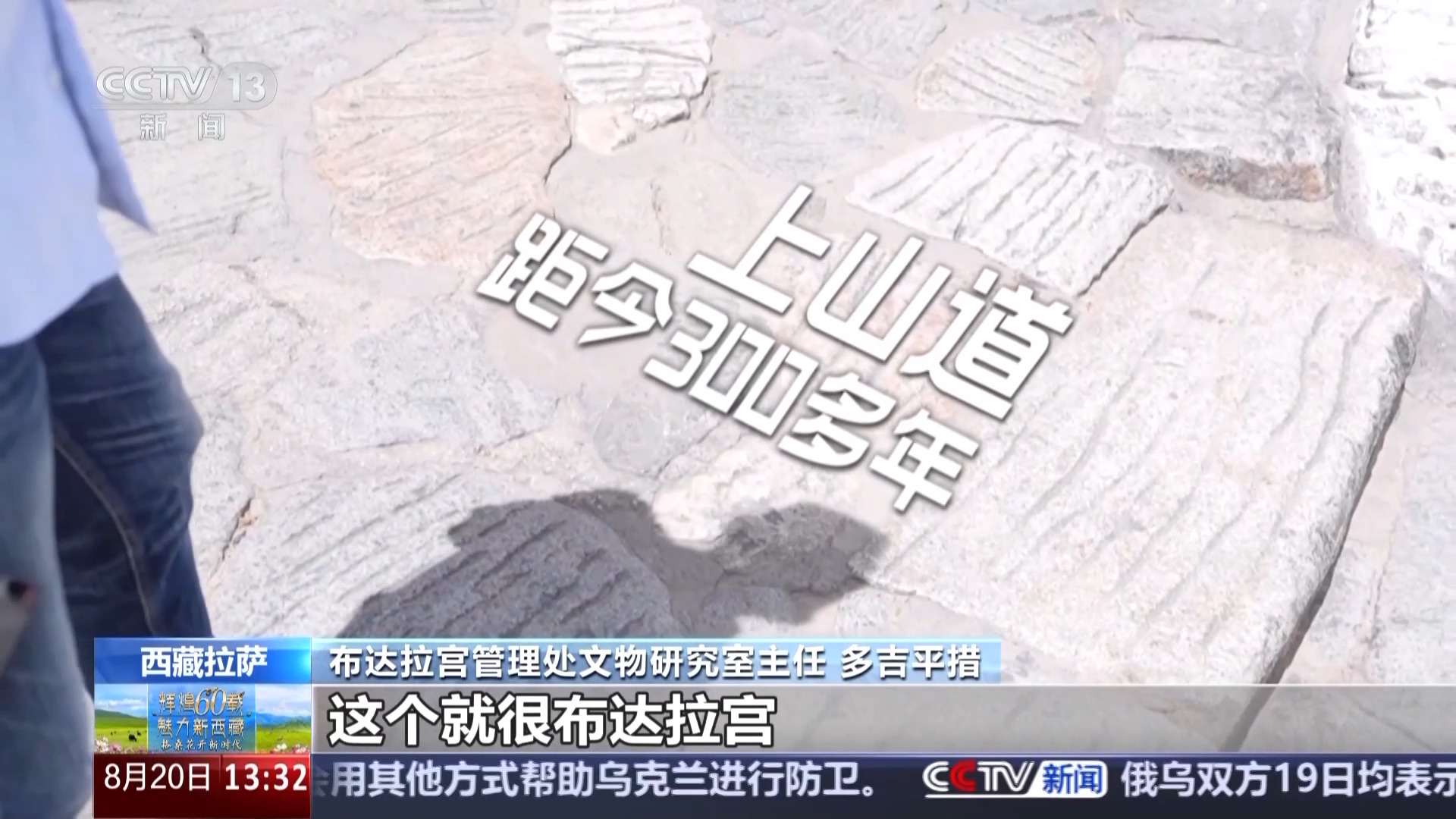 布达拉宫管理处文物研究室主任 多吉平措:每一个石块上的纹路,都是300年前的工匠用工具一条一条凿出来的。每一块石块都不一样,这个就很布达拉宫。