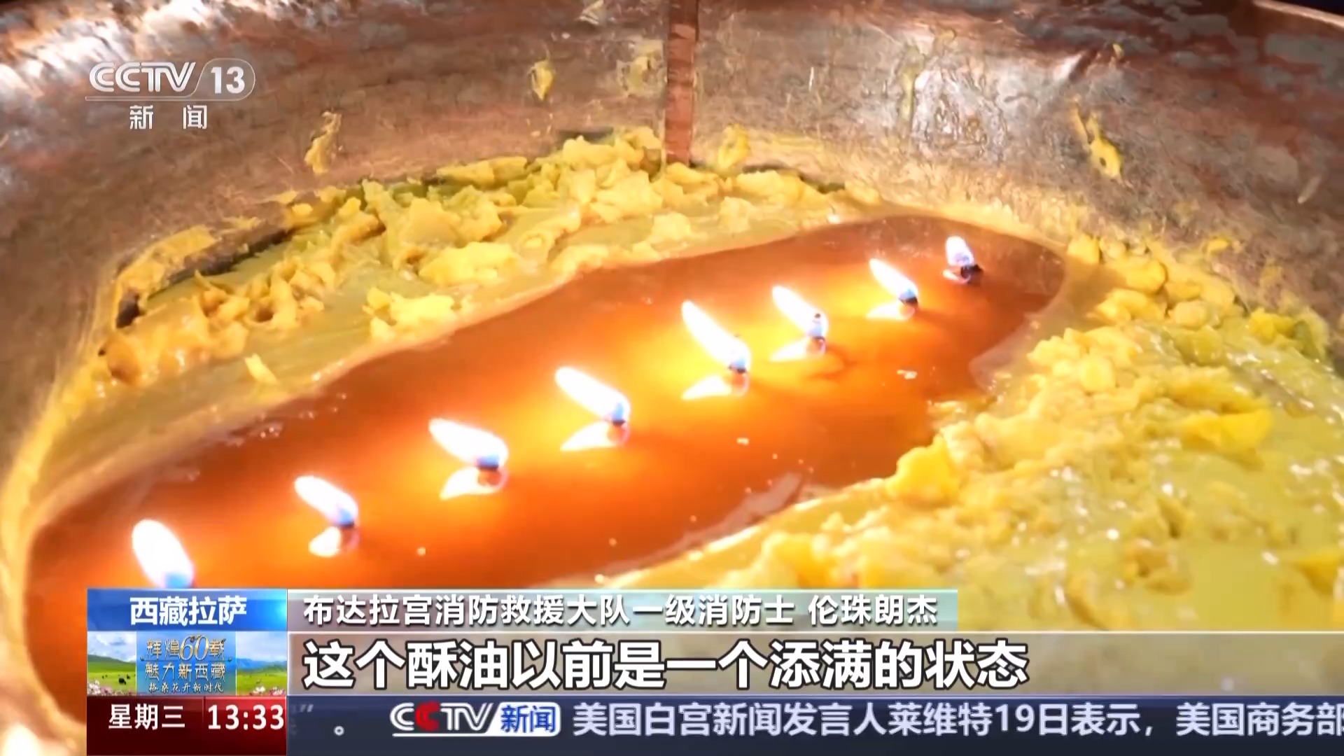 布达拉宫消防救援大队一级消防士 伦珠朗杰:这个酥油以前是添满的状态,这样给我们带来火灾隐患。后面我们大队统一做了这种刻度尺,这个(酥油)高度降低了20厘米,包括这个灯芯也是不能超过8颗,如果超过8颗温度就高了,就有火灾隐患。每天闭宫完之后一个大的检查,主要目的就是检查香炉里面有没有香灰复燃,确保安全。