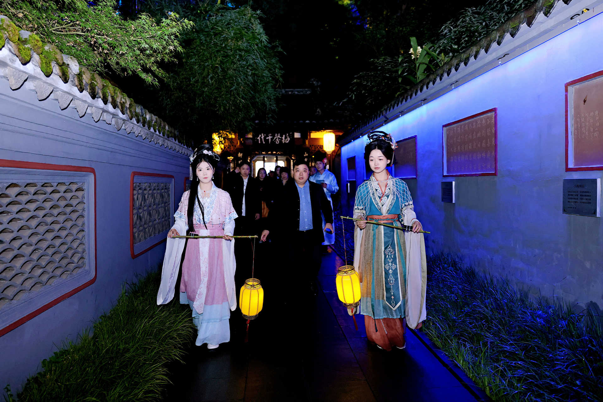 本次活动举办场地别出心裁,在罨画池的古典园林中,打造了一场从入场即开始的沉浸式文学之旅。嘉宾们可沿湖欣赏画舫清音,在银杏林中体验猜灯谜、投壶、点茶等丰富多彩的“宋潮”夜游项目,并提前观赏陆游祠内的“陆游诗意书画展”。