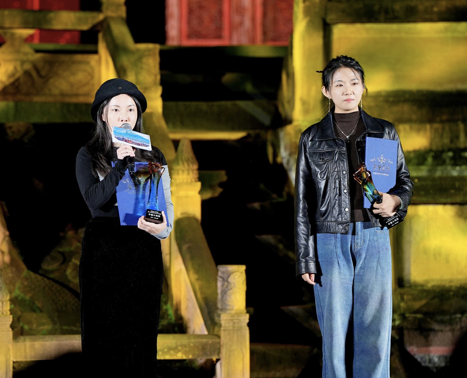 短篇小说奖获得者林檎(左)、孙昱莹(右)在台上领奖