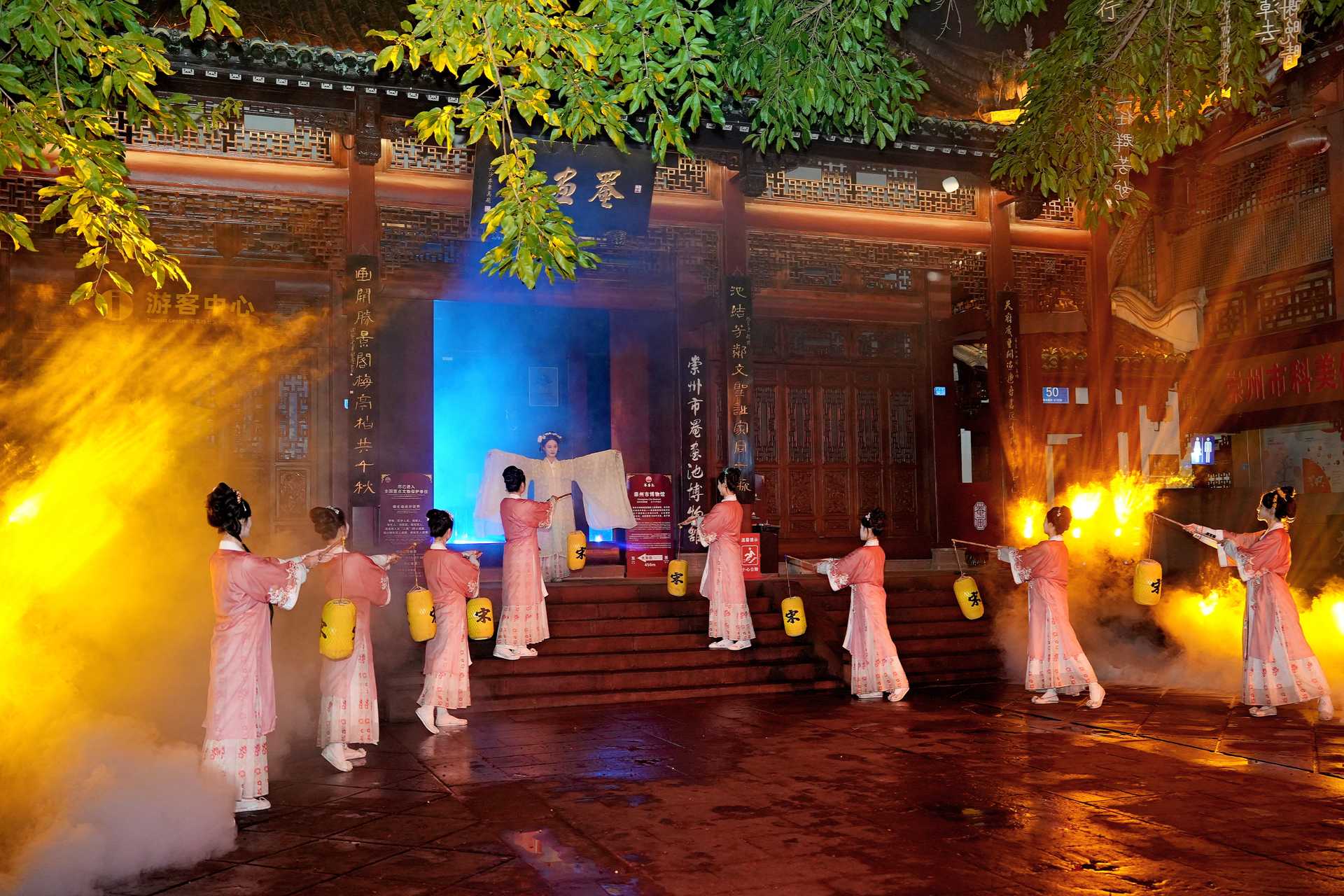 在朗诵节目《梦回罨画·诗见陆游》中,董凡、陈岳、张超、刘飞、王婵、舒予等六位成都朗诵艺术家协会的表演嘉宾,深情演绎了陆游的《示儿》《卜算子·咏梅》等经典名篇。配合现场精心设计的光影变幻,观众仿佛“穿越”千年,直接感受到放翁博大深沉的家国情怀与崇州质朴温暖的市井温情。