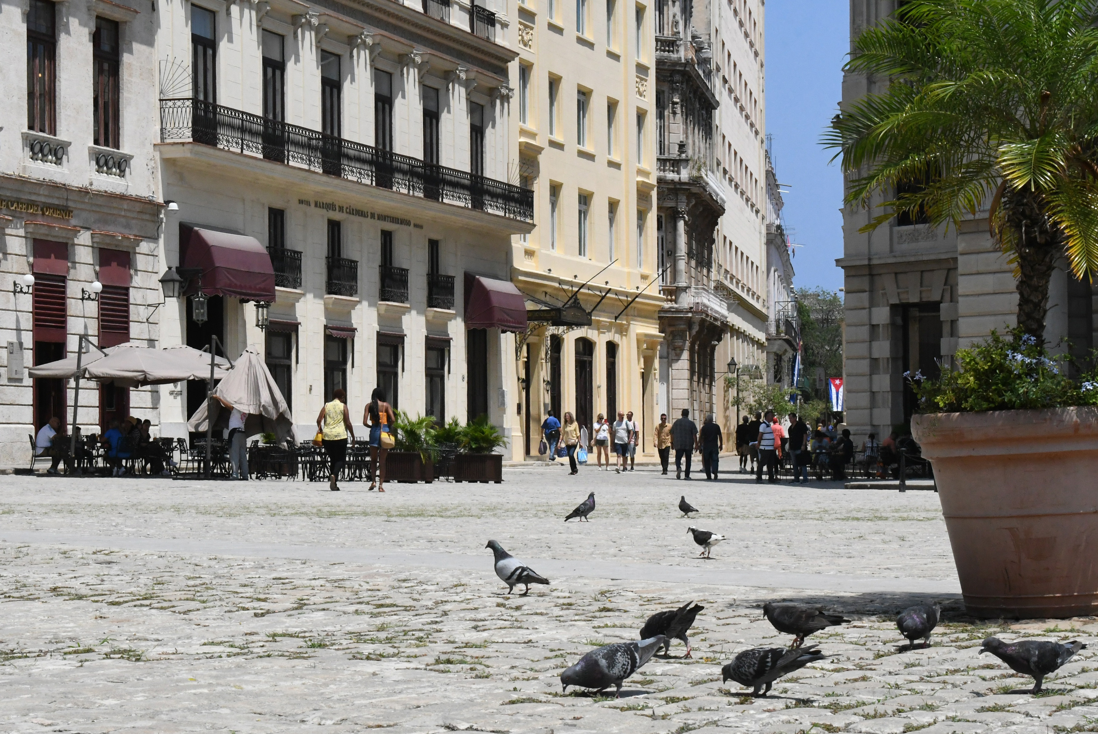 5月4日,鸽子在古巴哈瓦那旧城一处广场觅食。哈瓦那旧城于1982年被联合国教科文组织列入《世界遗产名录》。(新华社记者林朝晖摄)