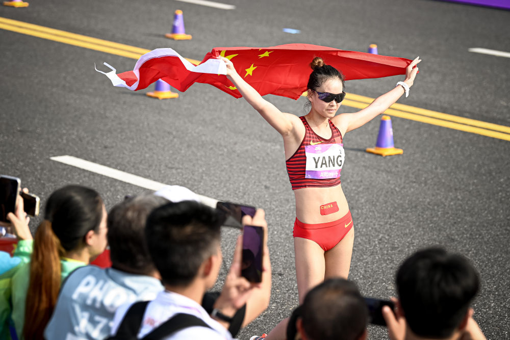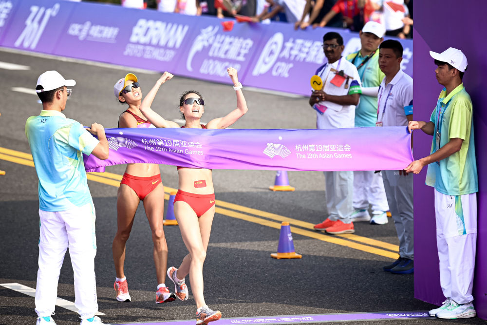 9月29日,杭州亚运会田径女子20公里竞走决赛在杭州智慧新天地沿江景观带进行,中国选手杨家玉以1小时30分03秒的成绩获得冠军,马振霞获得亚军。