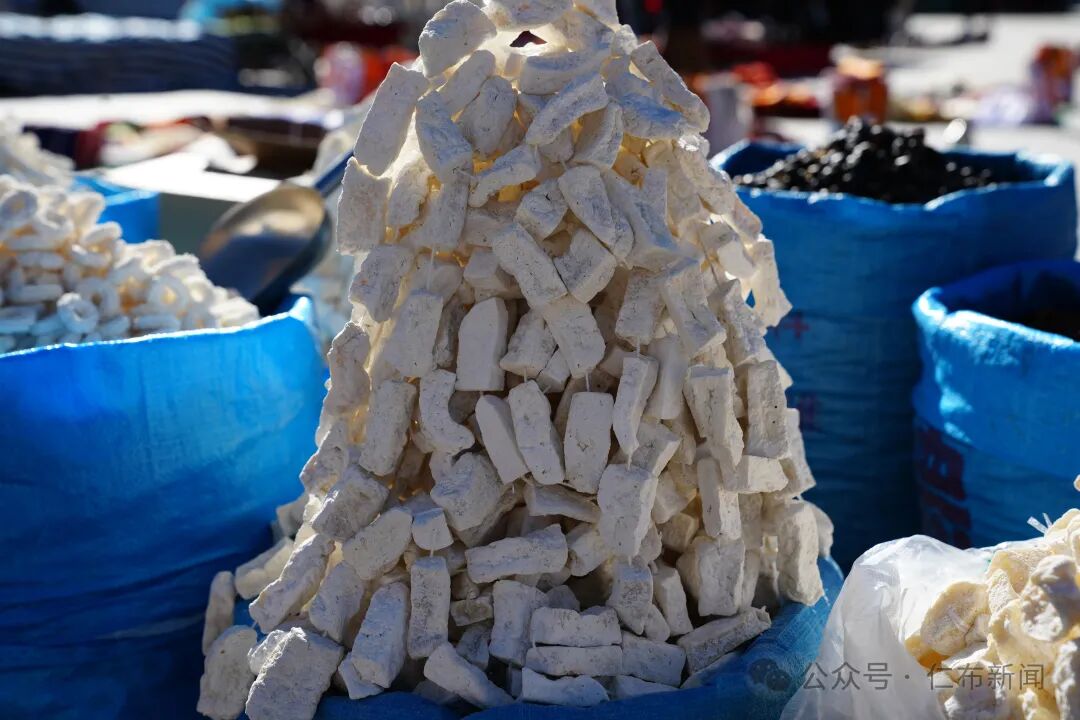 在食品区,传统的“卡塞”金黄酥脆,形状各异——蝴蝶形、耳朵形、条形,是新年茶桌上不可缺少的点心;成堆的奶渣洁白如雪,酸甜开胃;风干牦牛肉成排悬挂,是冬日里最扎实的蛋白质来源。