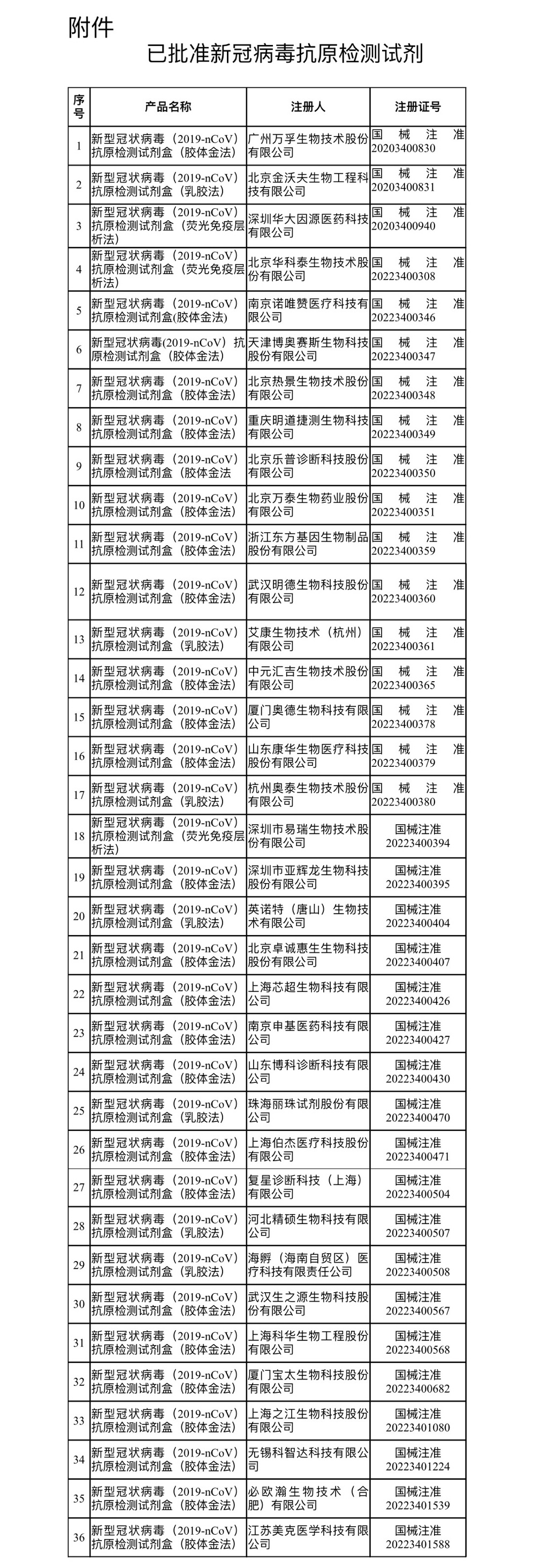 36个已批准新冠病毒抗原检测试剂。图源:国家药监局官网